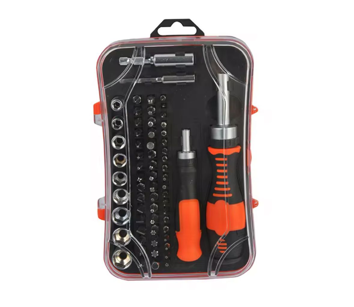 - Es un juego de 65 piezas que incluye mangos de destornillador de 4 mm y 1/4", barras de extensión y una variedad de puntas y vasos.